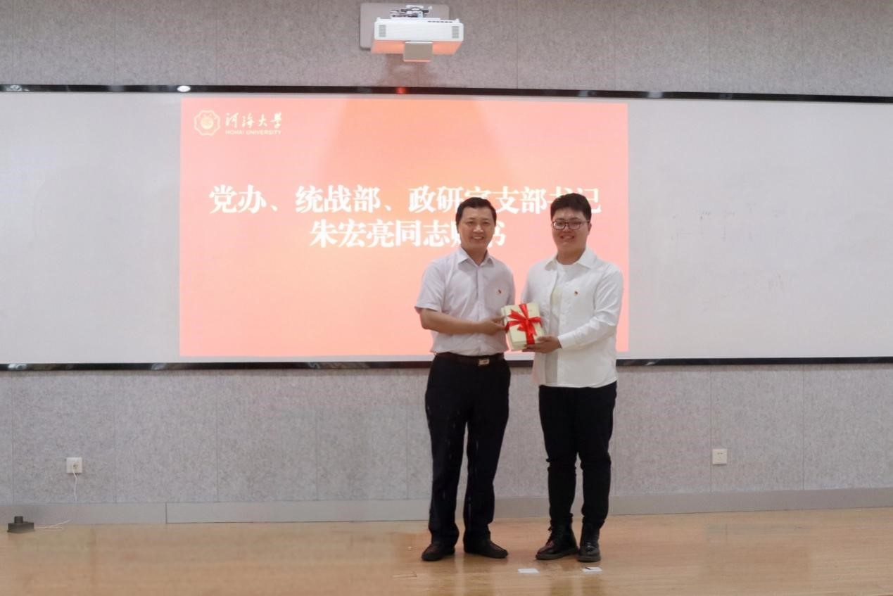 校党委副书记郭继超高度肯定了国际经济与贸易专业本科生第一党支部党团共建的有益做法和优异成绩。他指出,机关党支部与学生党支部结对共建是机关党员干部深入一线开展调查研究,落实“立德树人”根本任务和巩固拓展“我为师生办实事”实践活动成果的重要举措,要打造共建特色、树立典型标杆,实现师生联动,同“学”共“进”。他还表达了对毕业生的殷切期望与祝福:一是要继续培养国际视野,充分发挥专业优势,从多维度提升自我,心系“国家事”,肩扛“国家责”,坚定信念,紧跟党走,用奋斗点亮青春火花。二是要坚定“河海人”的自信,用信仰为青春定向,用知识为青春赋能,用奋斗为青春添彩,用正气为青春护航。三是要加强和母校的联系,母校永远是同学们坚强的后盾,记得常回家看看。 (文/魏俊美 编辑/刘开兵)