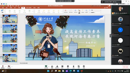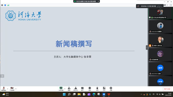 为全面提升学院团学组织宣传队伍建设,提高新闻宣传水平,增强新闻意识和写作能力,9月18日,博彩网 常州校区开展了“提高宣传工作素养,展现河海青春力量”主题业务培训。培训活动邀请了河海大学大学生融媒体中心的曾兰茜、杜开泰、张幸霏等三位同学,分别就公众号运营、摄影技巧、新闻稿写作相关内容进行线上培训,学院团学组织宣传工作骨干参与了本次培训。