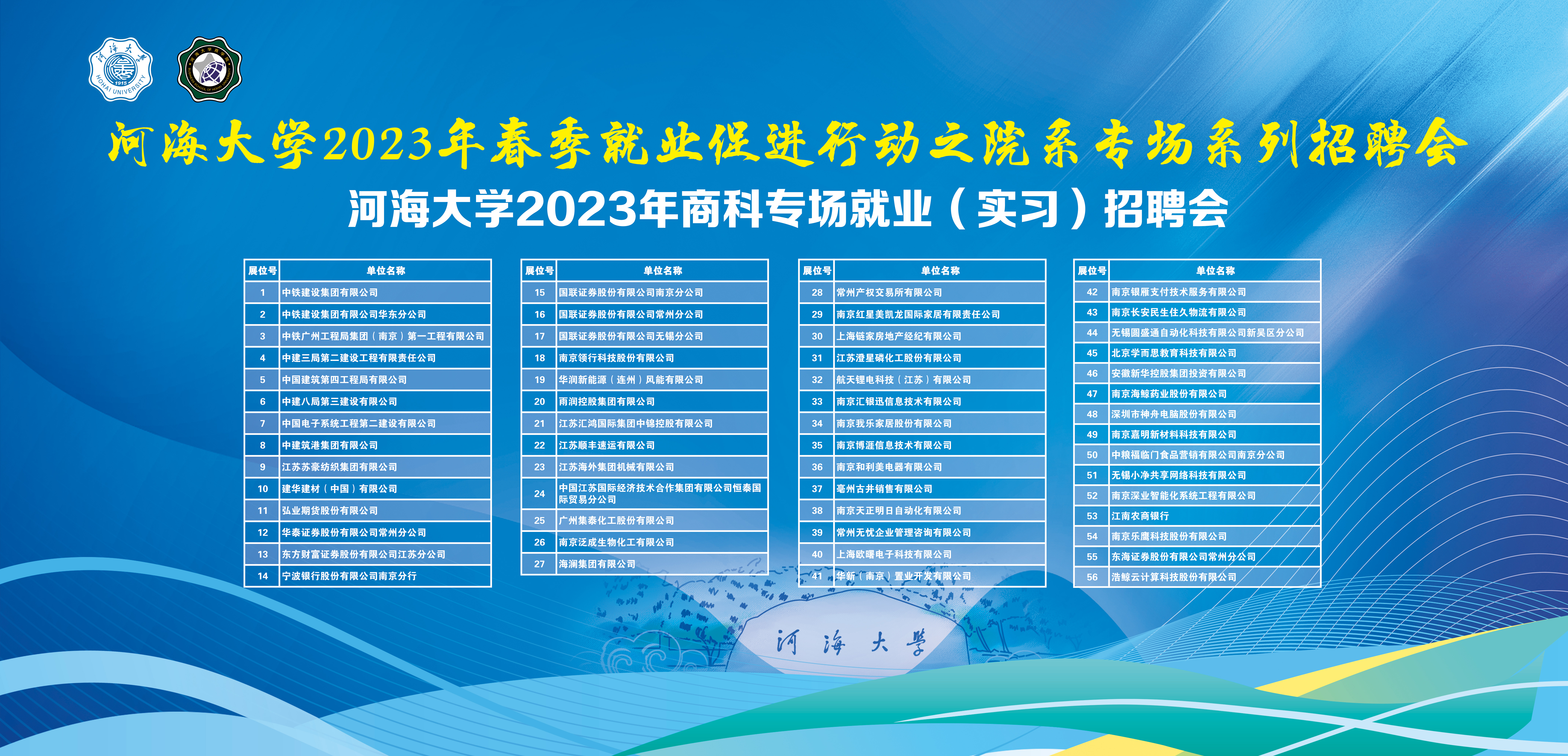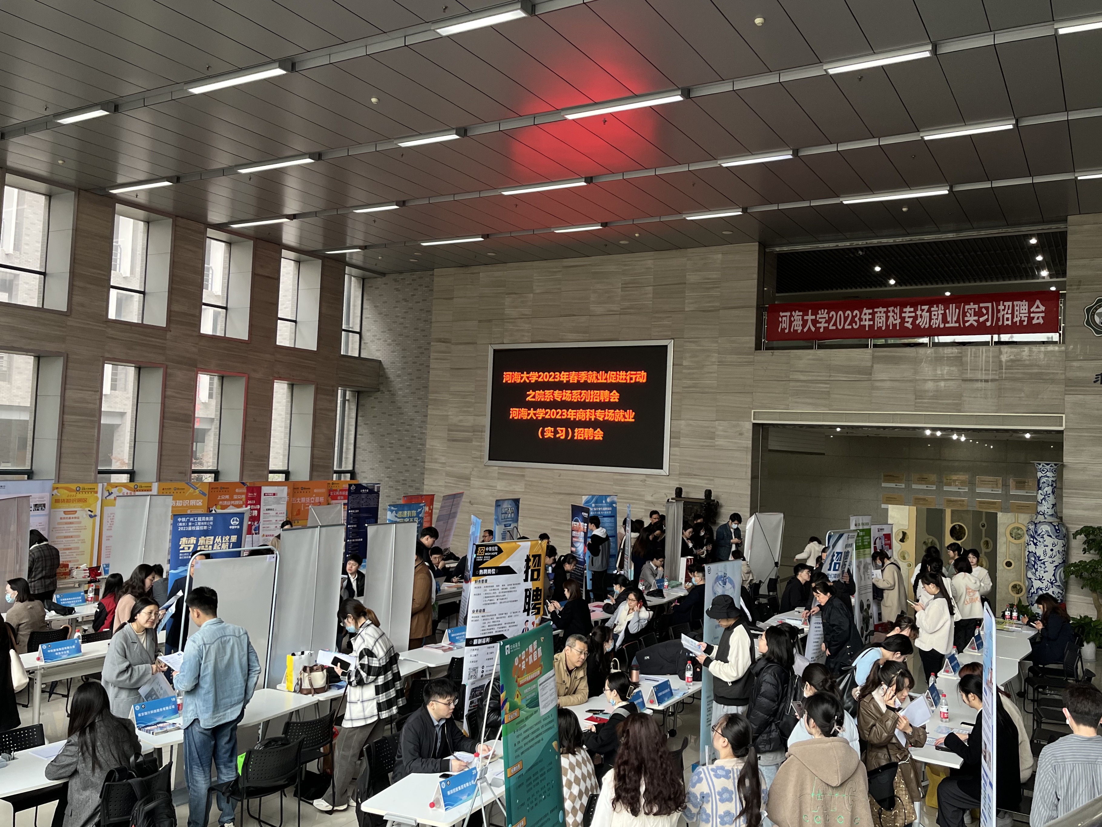 为深入学习贯彻党的二十大精神,贯彻落实党中央、国务院“稳就业”决策部署,进一步拓宽毕业生就业渠道和资源,近日,博彩网 积极响应河海大学2023年春季就业促进行动之院系专场系列招聘会活动,主动对接国有企业、事业单位、大中型民营企业,邀请中铁建设集团、中建八局、苏豪集团、常州产权交易所、弘业期货、华泰证券、浩鲸云计算等56家用人单位在博学楼大厅举办河海大学2023年商科专场就业(实习)招聘会。招聘会为毕业生提供500余个就业(实习)岗位,涵盖建筑业、互联网行业、金融业、制造业等多个行业。