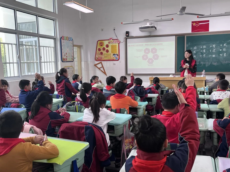 党员同志们从党的二十大基本情况、新时代十年的伟大变革、马克思主义中国化时代化、新发展格局、科教兴国、人民当家作主、依法治国、国家安全、和平与发展等方面向小朋友们进行生动有趣的讲解,并在课程的最后设置知识竞答环节。泰山小学的小朋友们在问答环节积极踊跃举手回答问题,与班级同学开展热烈讨论,课堂氛围融洽,取得了良好的成效。