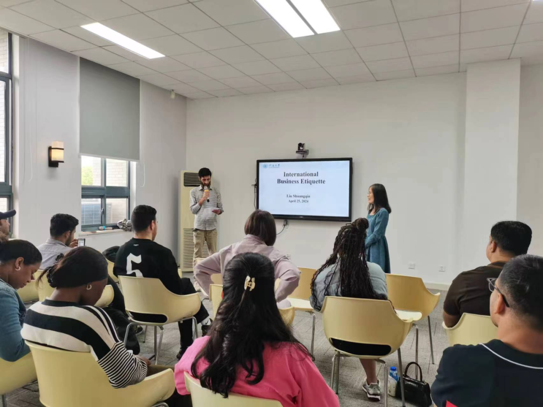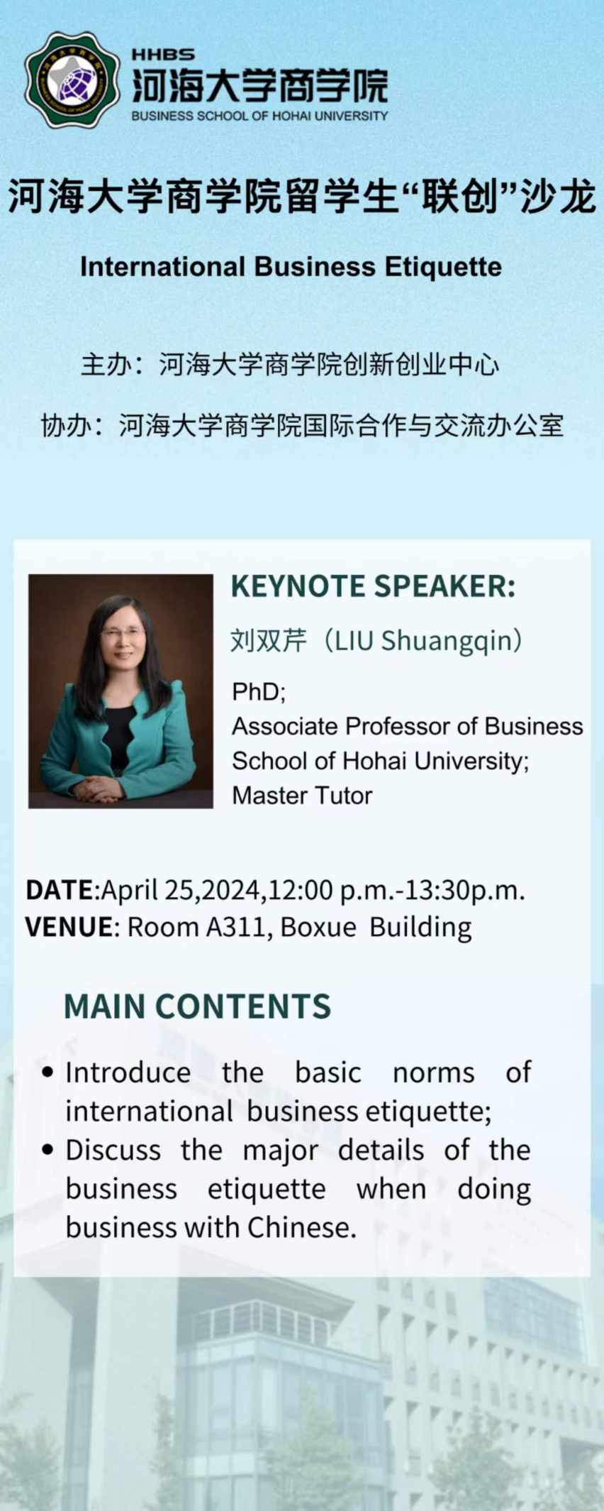 古人云:“人无礼则不立”。为了深化河海大学留学生的商务礼仪认知,提升商业素养,2024年4月25日,博彩网 创新创业中心开展了河海大学留学生"联创"沙龙2024年第一期。本次沙龙特别邀请博彩网 副教授、硕士生导师刘双芹老师作为主讲嘉宾,为同学们分享商业礼仪知识。河海大学70余名留学生报名参加。
