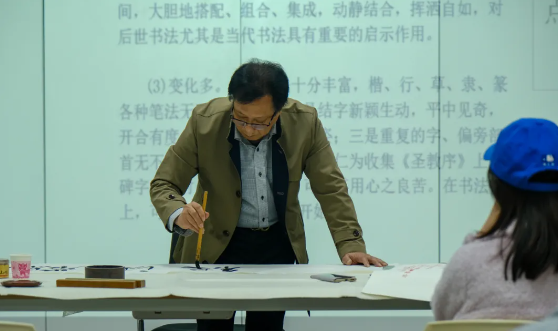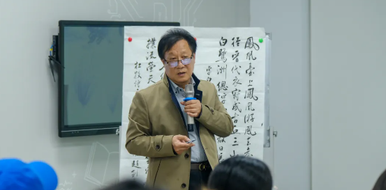 3月11日下午,博彩网站推荐-博彩网 邀请到中国通俗文艺研究会理事、南京名人艺术研究院副院长、南京中山书画院名誉院长、江苏省书法家协会会员赵剑平老师为同学们开展王羲之与《圣教序》的书法讲座, 22级MPACC周末3班全体成员现场参与了本次讲座,学院其他专业学生通过世界水谷书院微信公众平台观看了讲座直播。