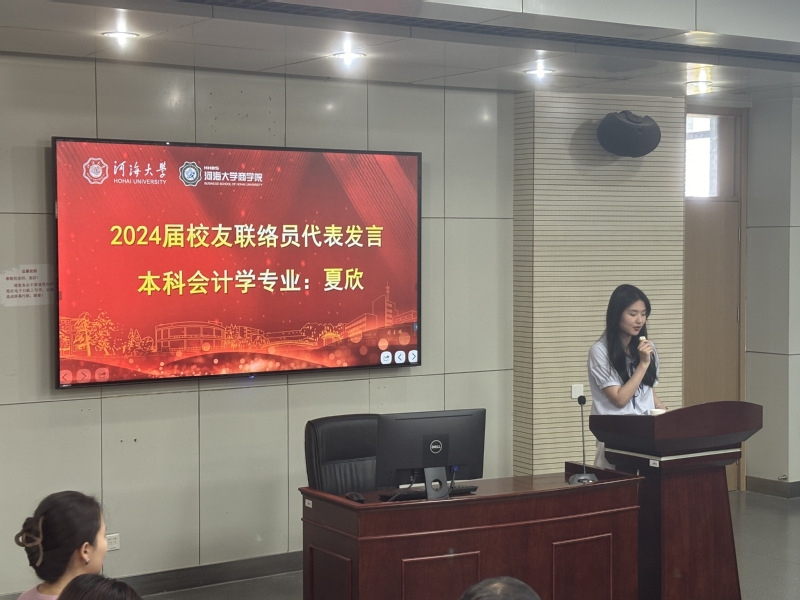 2020级会计学本科毕业生夏欣同学代表受聘校友联络员发言,她回忆了在校的成长经历与恩师教诲,感谢学校的培养与信任,承诺恪尽所托,积极强化校友工作意识,认真履行校友联络员的职责。