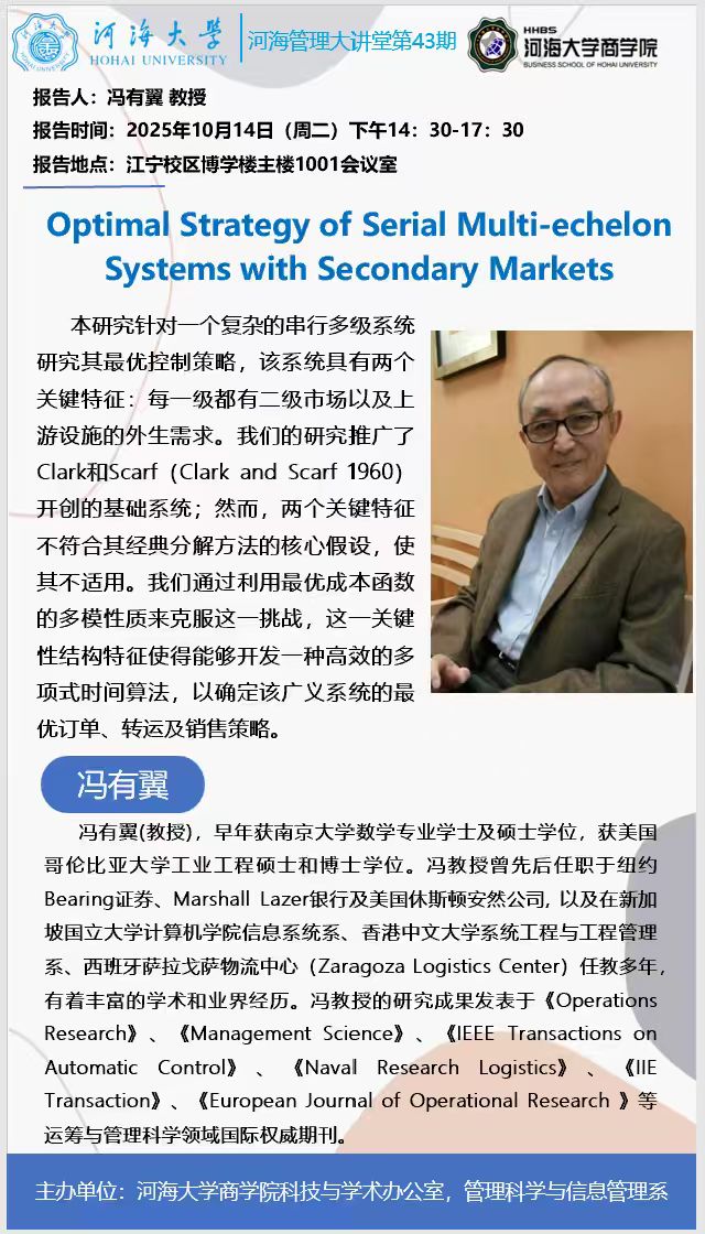 学术讲座通知:Optimal Strategy of Serial Multi-echelon Systems with Secondary Markets