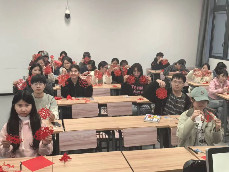 轮到最令人期待的实操环节,同学们全都跃跃欲试。红纸、剪刀、刻刀、垫板等工具一就绪,大家便依照讲解中的技巧要领动起手来。大家以剪为笔、以纸为媒,亲手裁剪心中图景,让传统技艺在指尖焕活。创作间隙,同学们还相互交流技法、分享灵感,现场洋溢着专注而热烈的氛围。